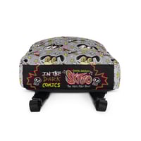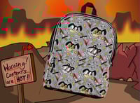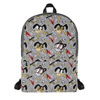 Exclusive Skitzo the Killer Bear backpack! Comes is a grey striped trim and is decorated with alternating faces of Skitzo, the Little (dead) Dog, and Skitzo's killer knife. The inside front pocket has a secret design of bloody skulls, bones, and Skitzo with red eyes.